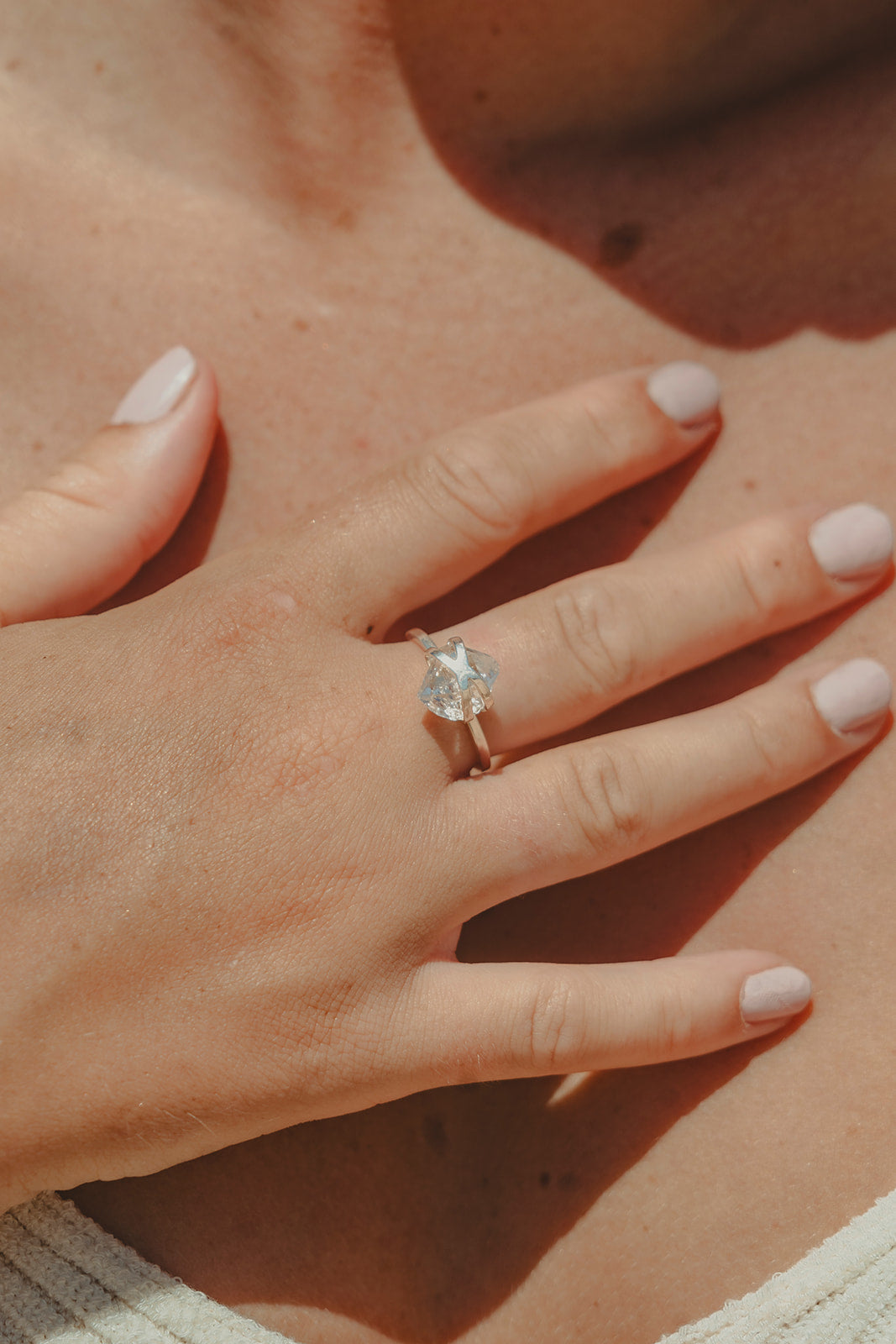 Bold, eye-catching and impactful flat band ring featuring a high vibration Herkimer Diamond.