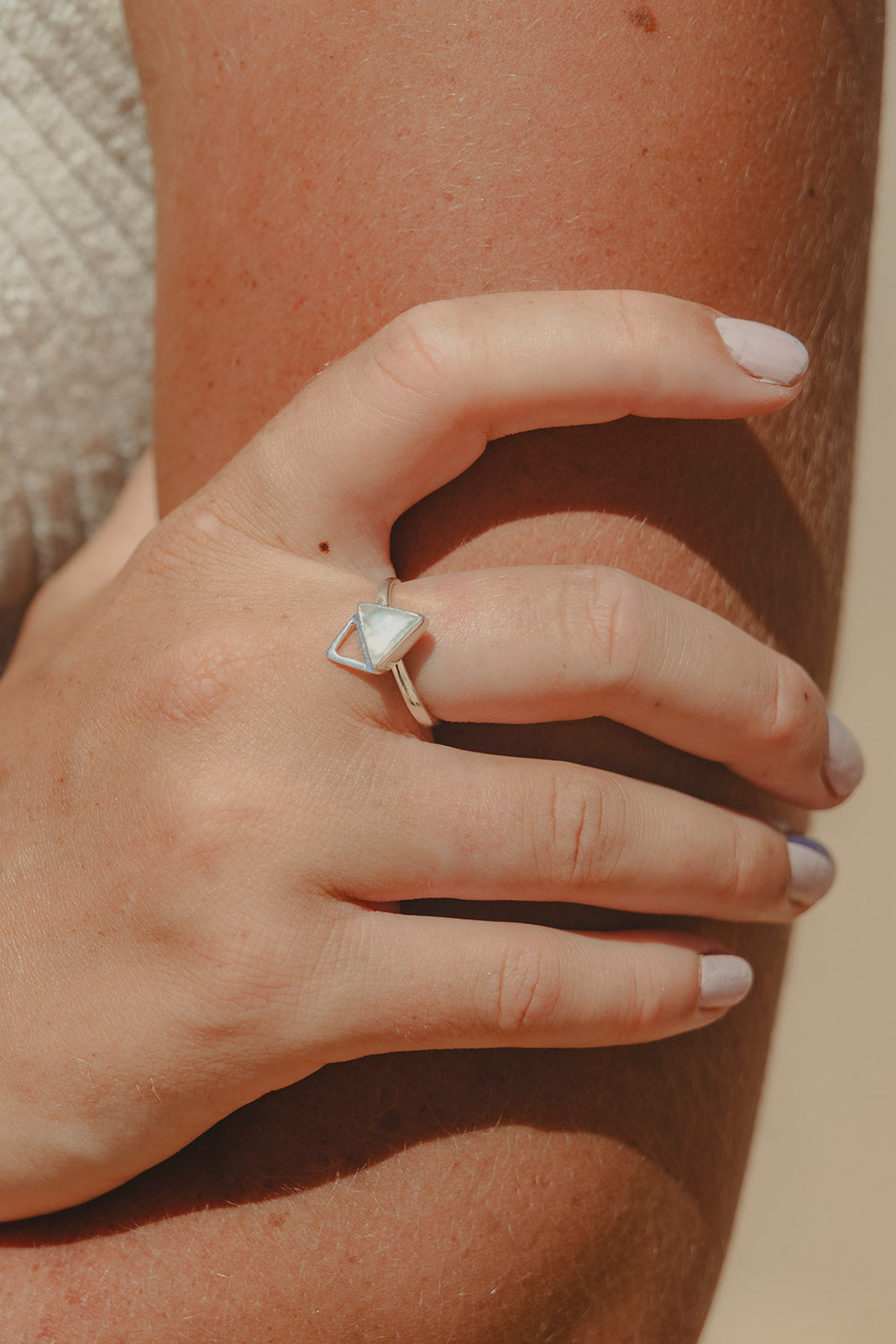 Tranquil Lagoon delicate flat band ring features the serene beauty of Larimar a stone from only one place in the world: the Dominican Republic in the Caribbean Islands.