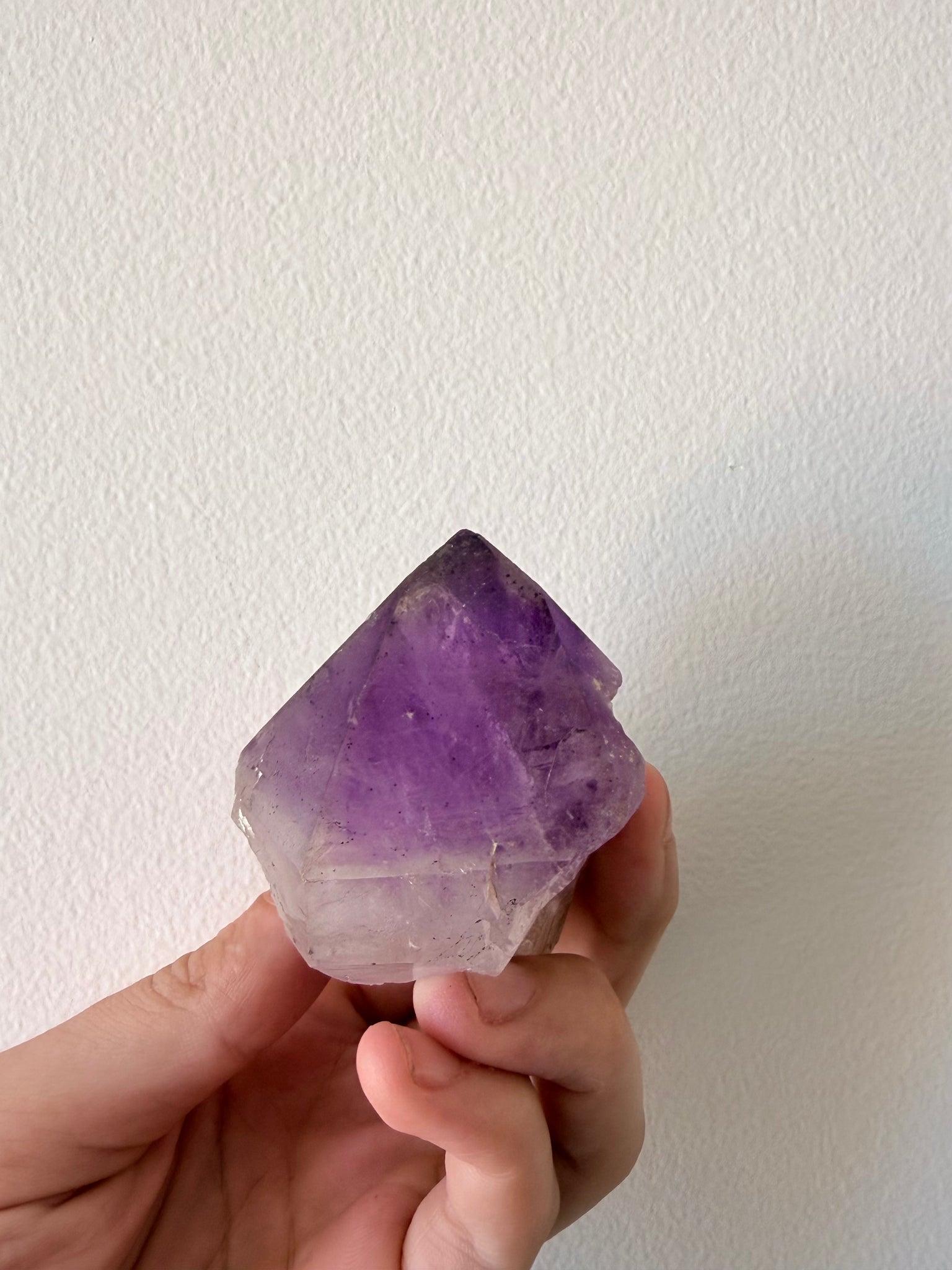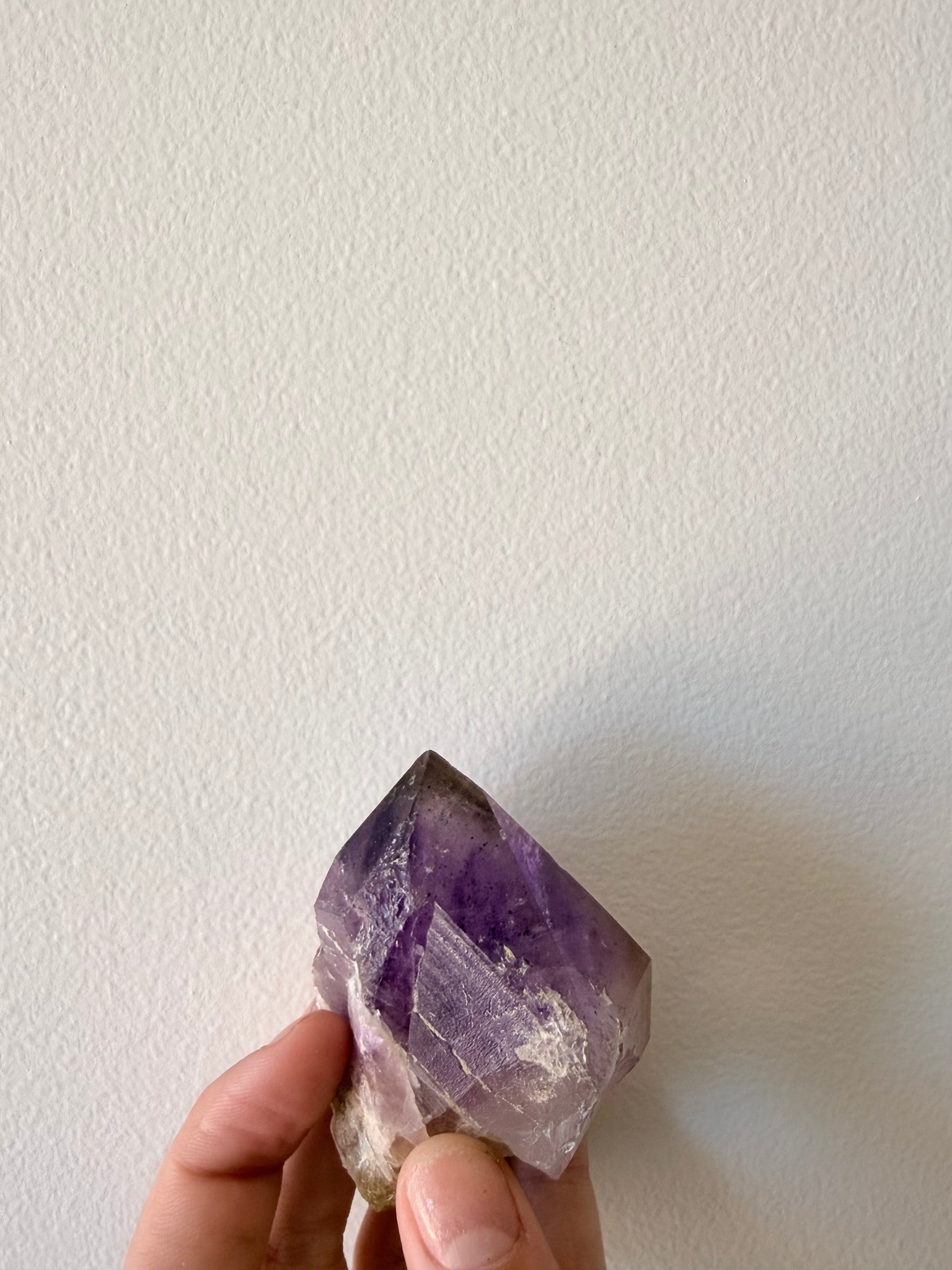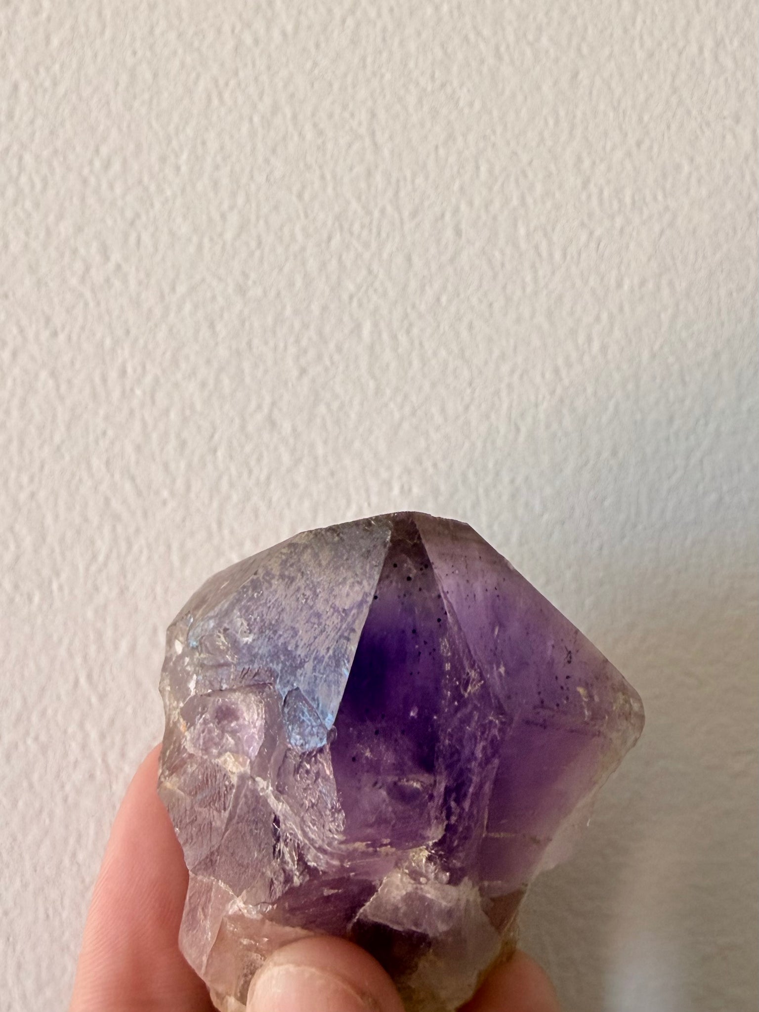Hand Dug Vibrant Amethyst Point featuring hemitite inclusions and rare record keeper triangles.