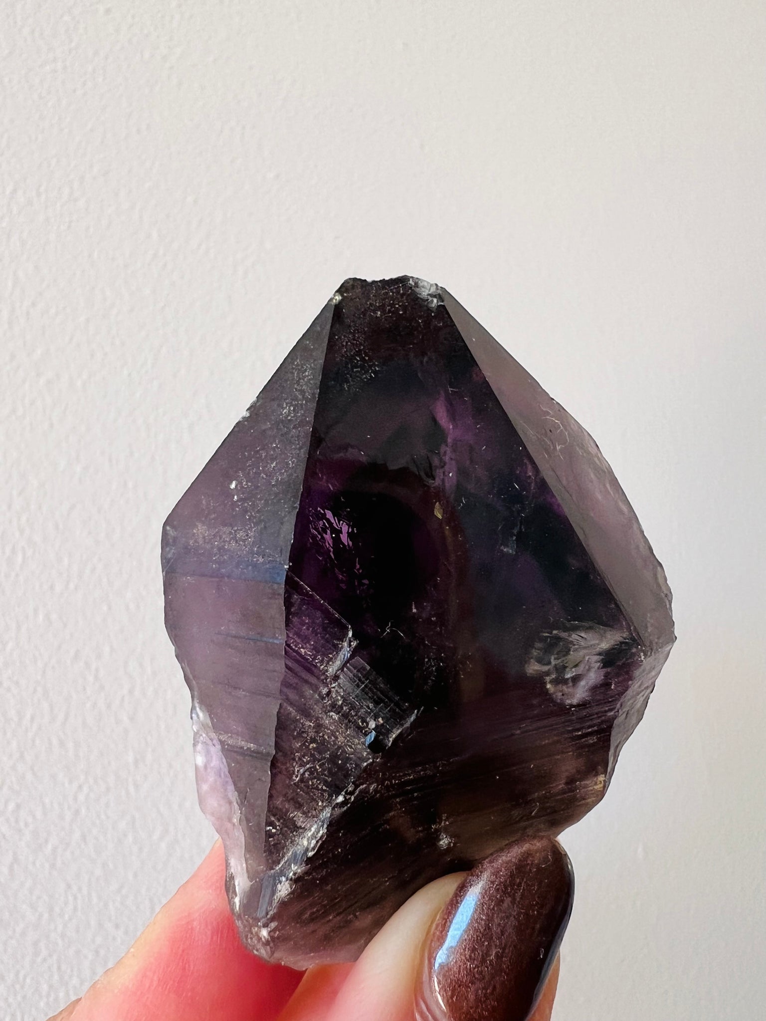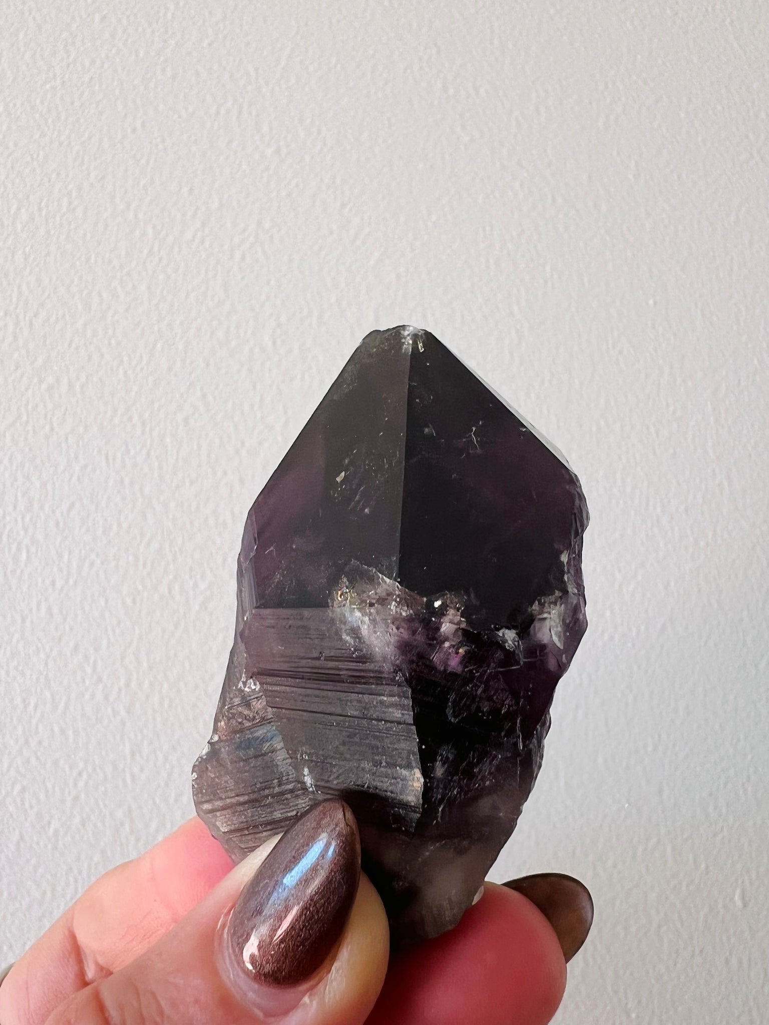 Hand Dug Rare Dark Smoky Amethyst Point featuring phantom inclusions, hemitite inclusions & pyrite inclusions.